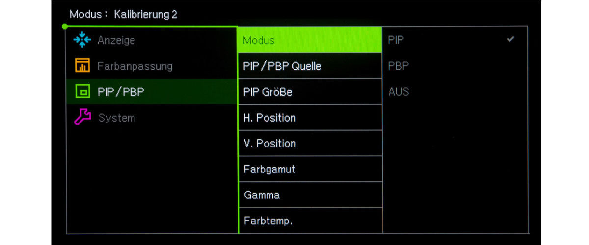 The BenQ SW320 is equipped with a very cool new feature called GamutDuo. With GamutDuo you can simultaneously display content in different color spaces next to each other for a direct comparison. To use the GamutDuo function, you must activate the PIP/PBP mode in the menu of the monitor. Here you can display the "Image" in two different color modes, or 2 different input signals in different color modes. You can also make the settings at the menu items Color Gamut, Gamma, and Color Temperature.