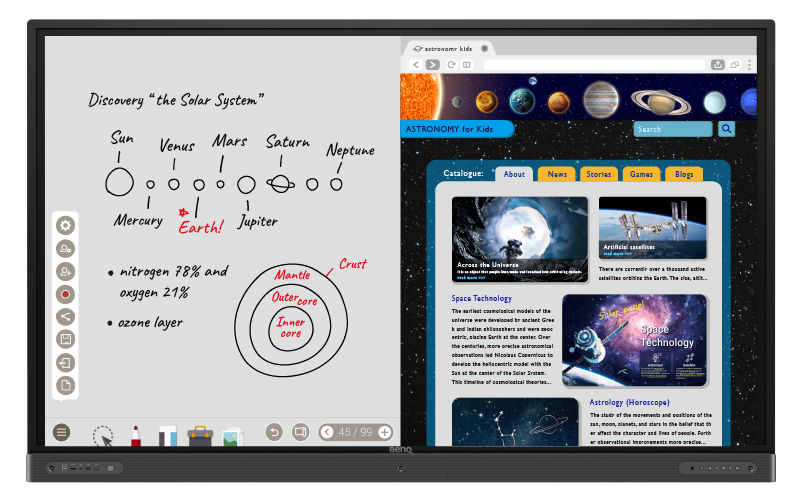 This feature allows users to multitask by running two apps side by side on the interactive display, doubling their efficiency. Teachers and students can look up information on a browser while whiteboarding at the same time.