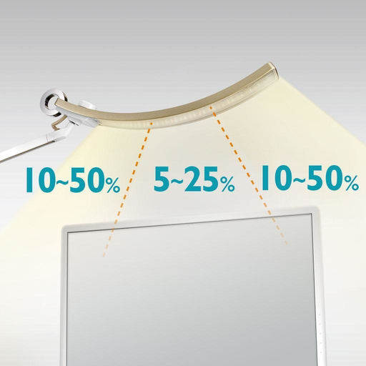 What makes the e-Reading lamp unique is its ability to light the entire dual monitor work area without creating monitor glare. The unique curved head generates a wider light pattern that is 150% larger than a typical lamp. However, despite that large light footprint, the advanced LED optics avoid casting light on the monitor itself, enabling you to easily look back and forth between paper and monitor content without eyestrain.