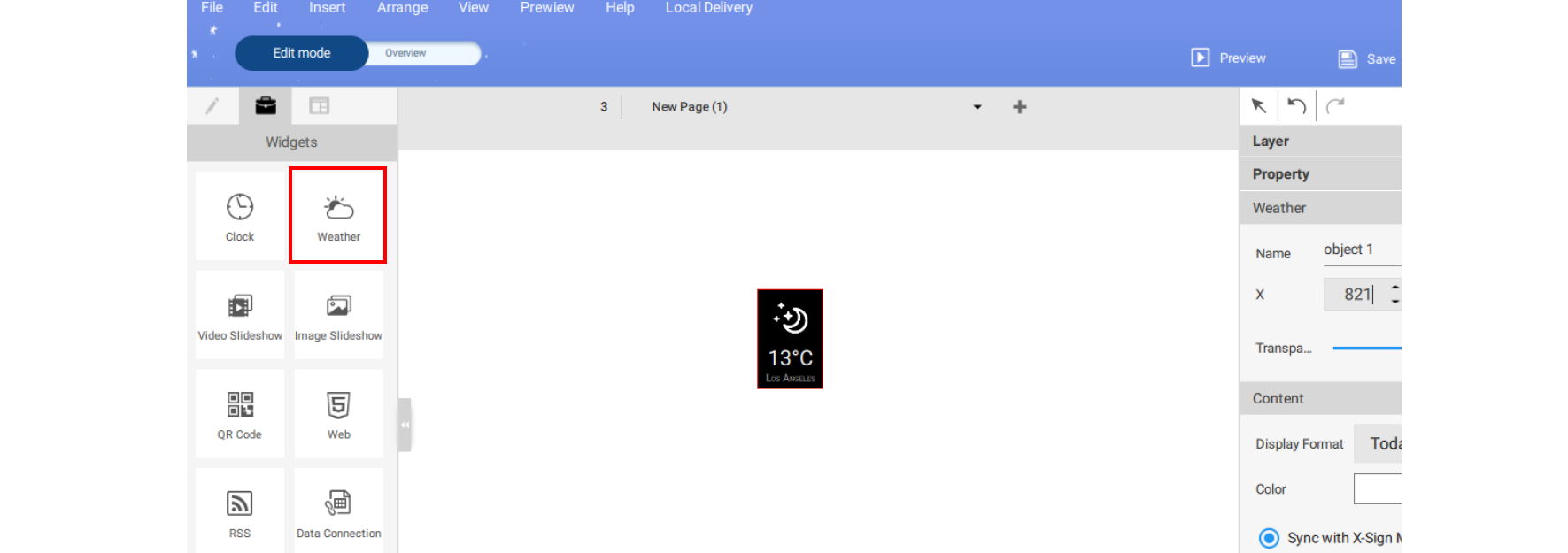 1. In X-Sign Designer, click on the icon to add a weather widget, and you will be prompted to place the weather widget.